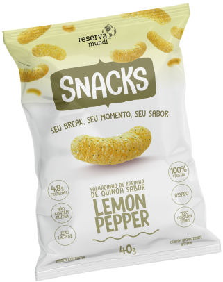 Farinha de quinoa branca, farinha de arroz branco, óleo de girassol, condimento preparado sabor lemon pepper (especiarias, sal, amido de milho, maltodextrina, açúcar, extrato de levedura, limão e aroma natural), sal marinho e aroma natural extrato de alecrim